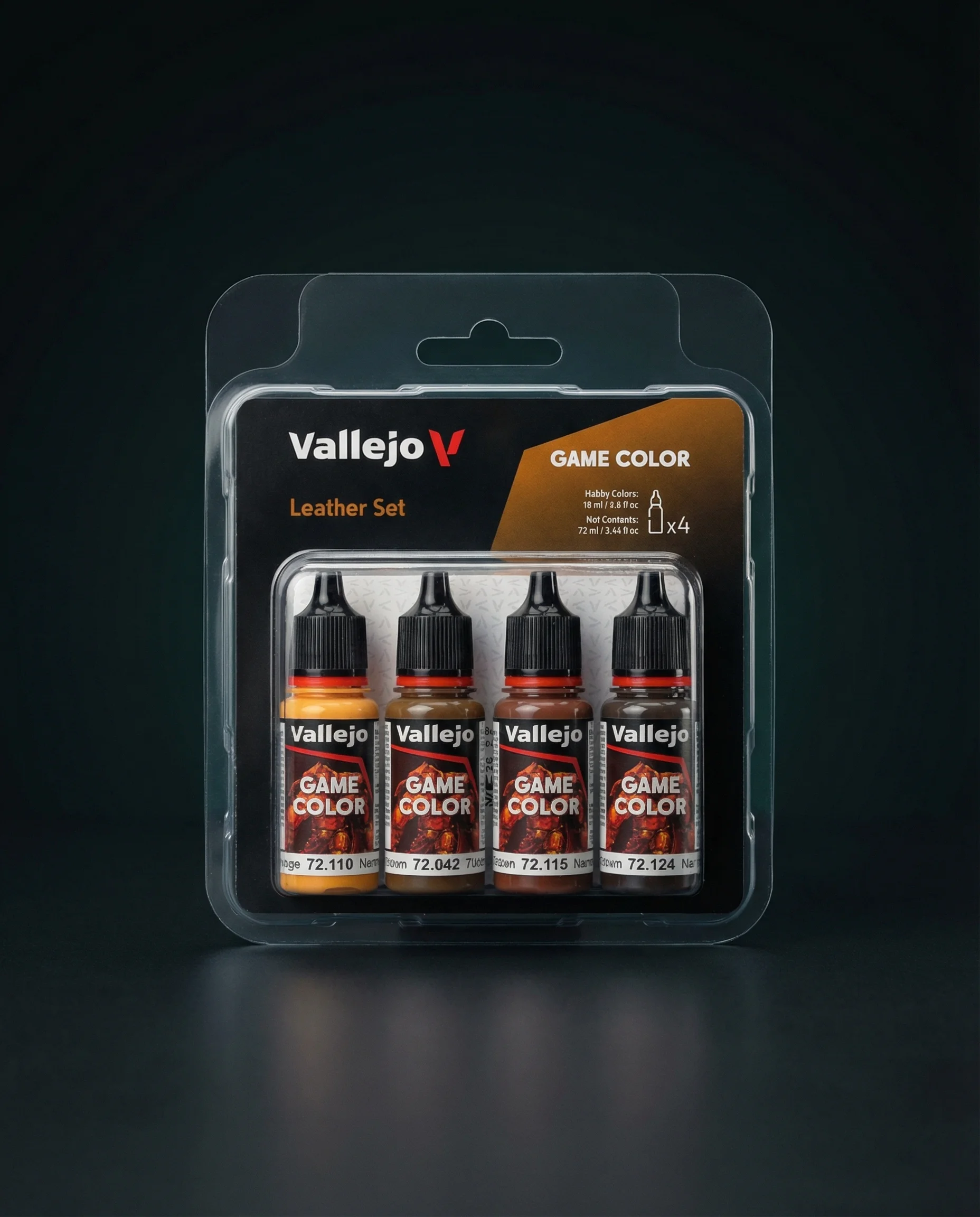 The set contains four brown shades, designed for painting all types of leather elements in warm tones: a base color, a shadow color and two highlighting shadows.
