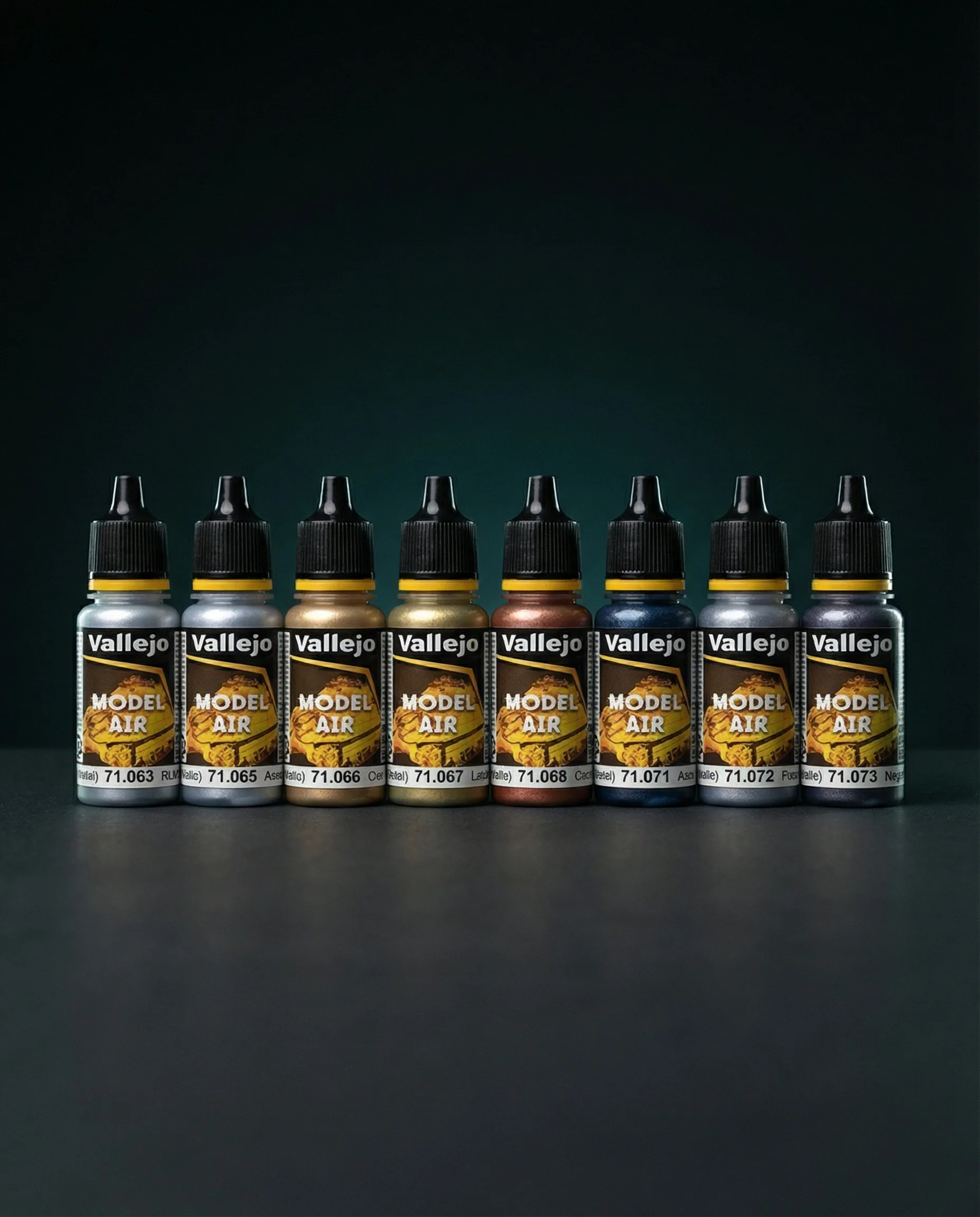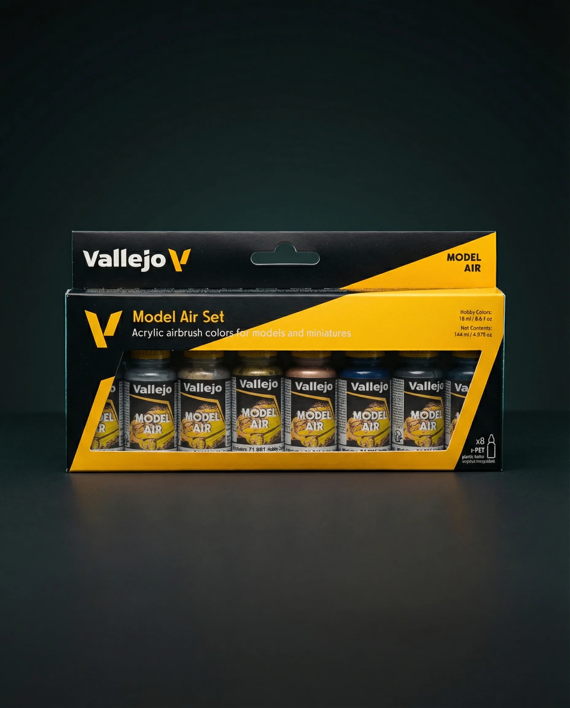 Set of 8 Model Air references for painting models, figures and dioramas. Containing bottles of 17 ml./0.57 fl.oz. (with eyedropper) and a color chart.