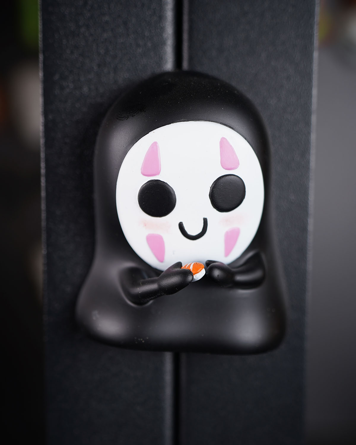 Adorable chibi-style No-Face holding a treat, sculpted as a cute collectible magnet inspired by the Studio Ghibli classic Spirited Away.